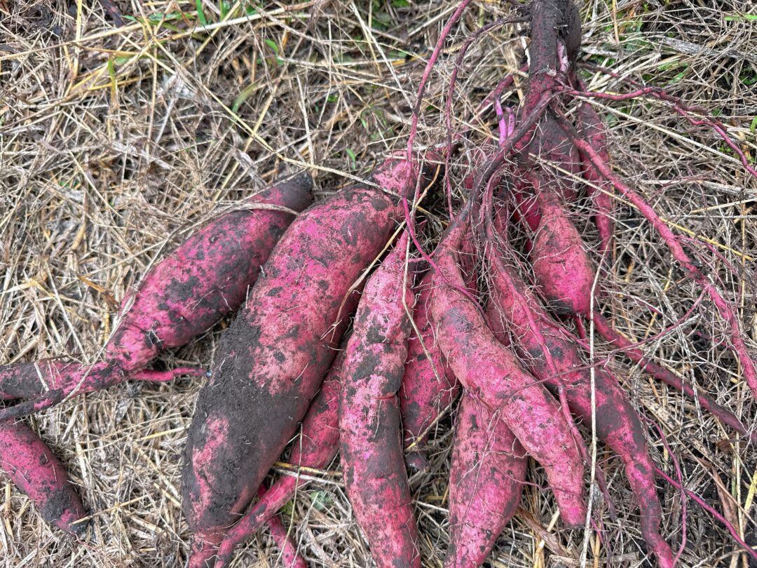 (2)サツマイモを収穫します!品種は、紅はるか・シルクスイート・すずほっくりがあります。ぜひお楽しみください!